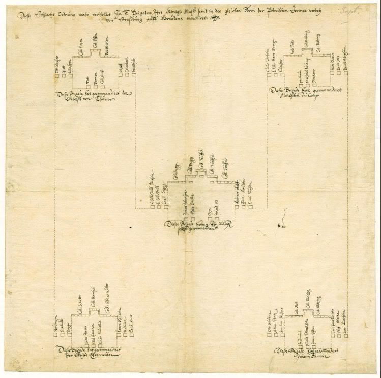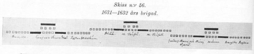 An old, out of date diagram? The 4-squadron brigade not used during the TYW? Care to provide sources to back up those statements? The historians employed by the General Staff, Bertil C:son Barkman and Richard Brzezinski all disagree with you. As does Gustavus himself since the 4 squadron brigade appears in at several of the diagrams of the deployement used by the Swedish army drawn by his own hand, all dated to the TYW period. Lord Reay (Col. Mackay)recorded it for posterity as well. The apperance of the "Swedish brigade" is directly linkedto the Swedish entry into the TYW on large scale in 1630. (Sweden had been involved in the war on small scale from 1628) Indeed there is no evidence for it's use prior to 1630. The document previously dated to 1628 which was used as evidence for the use of 4-squadron brigades can now be proven to belong firmly to 1630 due to the presence of units which either did not exist in 1628 or were not deployed to Prussia. Said units did however form a part of the Swedish army in 1630. Furthermore the the presence of two units which in late 1630 were reformed into a new regiment narrows the gap even further and firmly places the document in 1630. picture While brigades are mentioned during the Prussian war of 1626-1629 a study of the surviving order of battles show that these brigades were much larger formations made up of both horse and foot. picture picture Nor do the deployments show the 'Swedish brigade' with typical shape. Instead you find infantry squadrons arranged in much larger, triangular formations inspired by Dutch tactics. (But adapted to the conditions of Swedish-Polish warfare) picture