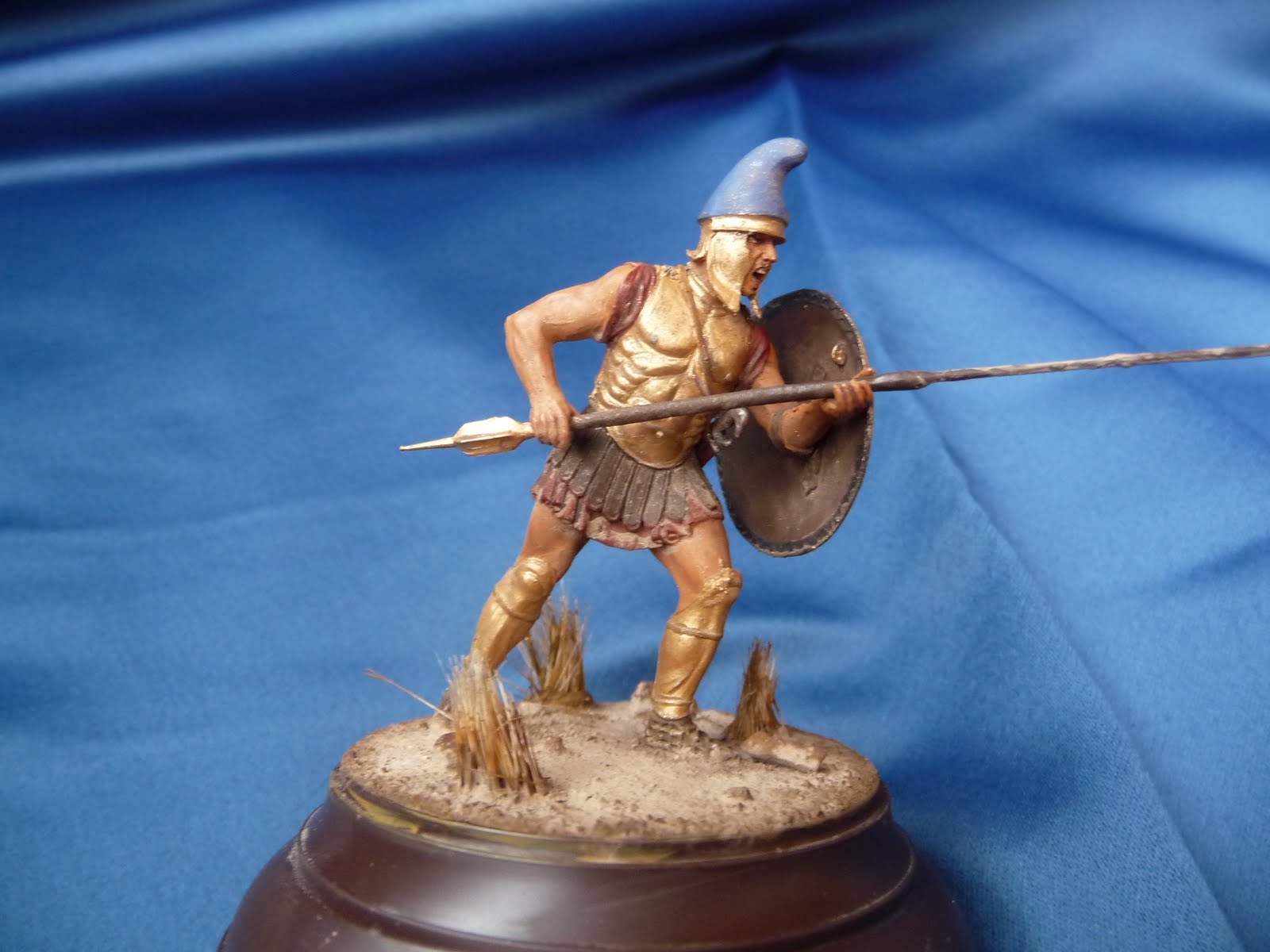 the gear seems appropriate.. but I'm not enamored of the pose.. the splayed out feet always make me feel .. this figure is not paying attention. The nice helmet makes this guy worthy of Pyrrhus and later Macedonian phalanxes. Rank three