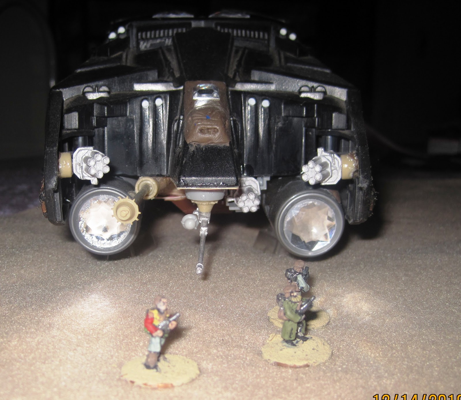 So, a while back I cobbled together a quick and dirty landed gunship/cutter sort of a ship out of an old Batman movie Tumbler toy. Adding some guns and bits and pieces and a crudely sculpted armored canopy made the shell of the vehicle into a passible ship. I haven't painted it yet, but here are some pics - picture picture What have you folks done for ships on the ground? Show us some pics! -Eli |