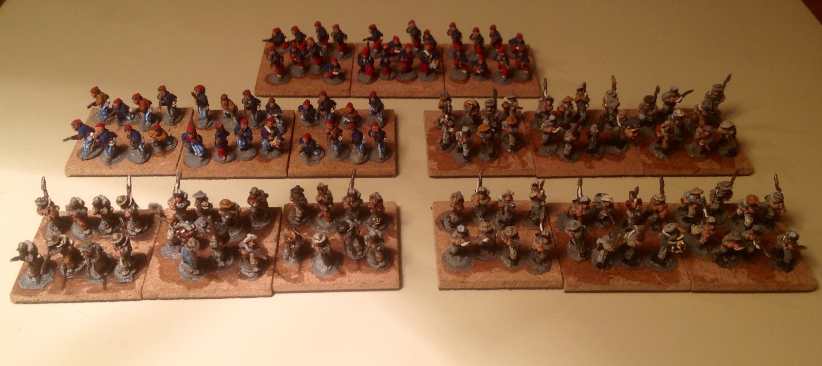 Thanks to everyone for your responses – really appreciated. So far they are unanimous in favour of hitting the stop button. That is a huge relief as I had got really bogged down in and by this project. The end is now much closer and I'm also encouraged to finish/start other projects where my perception of required detail had become self-intimidating. For my next trick I'm wondering how far this minimalist approach might be applied to 10mm 18thC figures, e.g. Seven Years War or American Revolution? My impression is that with 10mm figures, cuffs, facings and even hands more-or-less disappear at playing distance. Crossbelts add a degree of lightness but are not distinct. That would leave to paint: hat, face, jacket, upper legs, lower legs. I'm assuming the figures would be brown undercoated with that colour sufficing for muskets, flag poles and 'shadow' areas. The waistcoat area could be painted if it is the same colour as the upper legs and is not obscured. Cartridge boxes and scabbards might be worth painting on light-coloured figures (e.g. French and Austrians) but probably not on bluecoats (Prussians, Continentals). I would balance the lack of detail by adding nice flags and well-textured bases, i.e. the things that are the most prominent and have the largest surface area. I haven't actually painted any figures according to this minimalist approach but I have copied colour plates from uniform books, reduced them to 10mm and printed them out. The results appear to substantiate these judgements. Apologies to anyone reading these 18thC speculations on an ACW board. |