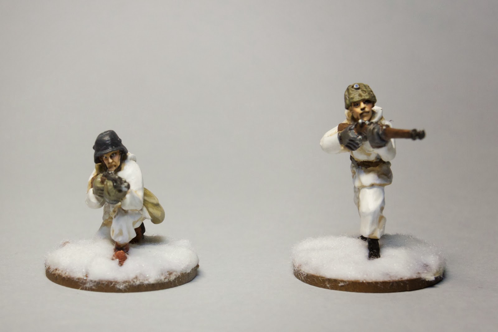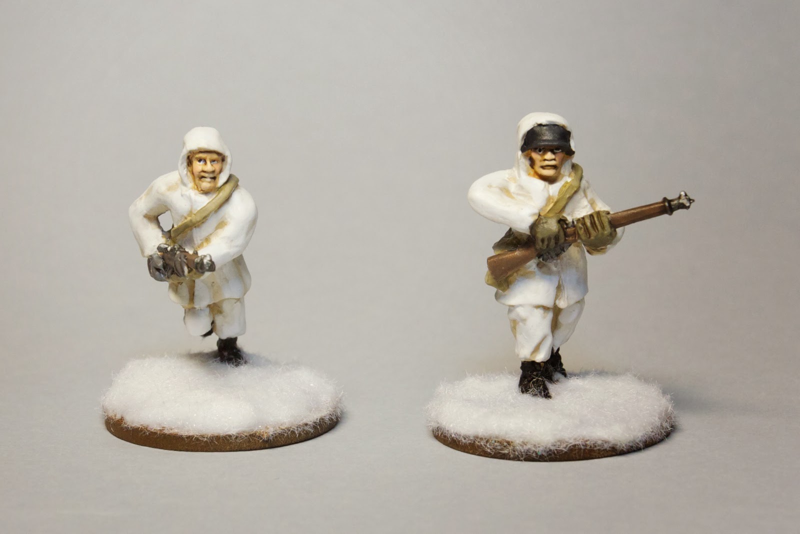 Your work is inspirational. While patiently waiting for my KS Finns to arrive, I broke down and bought some from Brigade Games, just so I could practice some colors. When the muses are singing, I listen. In the movie "Winter War" the Finnish troops were filthy, and got dirtier as the movie progressed. I painted mine accordingly. Then, looking at the real pictures, I see almost all the Finns seemed immaculately clean, all the time. Made me wonder if "muddy knees" just doesn't happen much when the temperatures are forty below zero? |