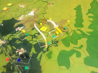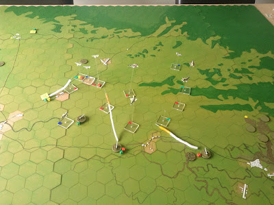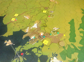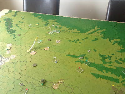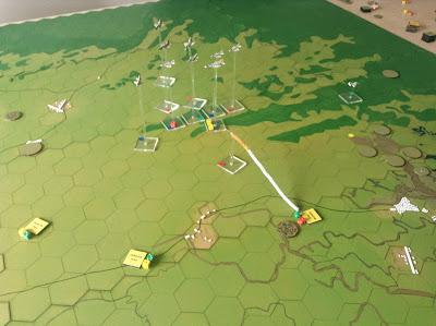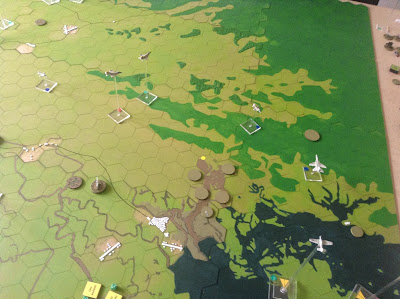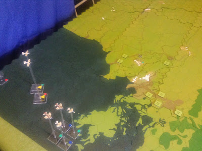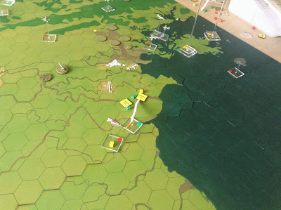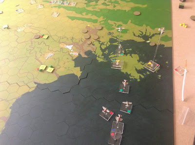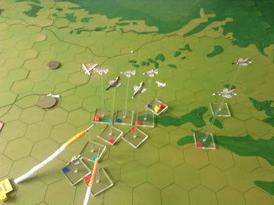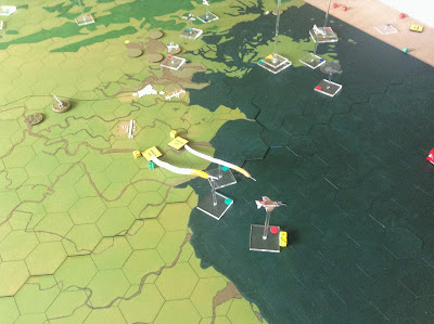Despite it being mid morning the Soviet trawler shadowing TG77.7 was no where to be seen. As a result the Alpha strike formed up to hit the Bac Giang had a head start on the defenders. It wouldn't be until the air wing was insight of the coast would the defenders begin to react. That is my reasoning for the poor DRV early warning roll of a 4 on 2d10 with a -2 modifier for it being a USN raid.