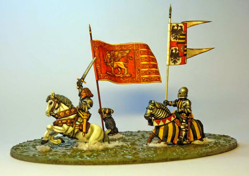 This vignette of mine was featured in an article in WArgames Soldiers and ytrategy along with Sascha Herms beautiful vignette of Niccolo da Tolentino Battle of San Romano's work and painting guide by Sascha too. There's also some great work from David Imrie in the new issua. Francesco Gonzaga Leading the (Doomed Charge) over the river Taro; Battle of Fornovo 1495