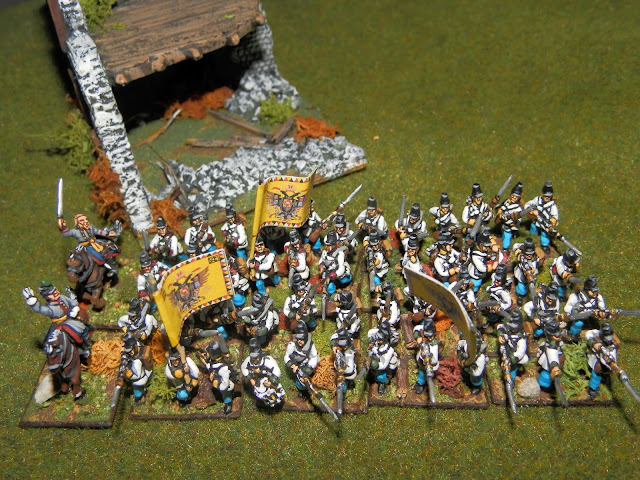 Phil your figures look fantastic. Beautiful paint job. I've painted over 450 of the same Old Glory15 (Nineteenth Century Miniatures) figures, but yours have mine beaten. I'm curious why you've labeled these figures as "1866 Austrians" though. They are sold as "1859 Austrians" because they're wearing the white kittel characteristic of the Second Italian War of Independence fought against the French. The Austrian infantry in the 1866 war wore the grey overcoat in the field, at least that's what I've read. I'm presently about to begin painting an 1866 Austrian army so I can cover both wars. |