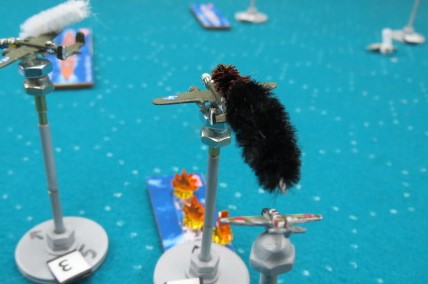 We played a fun game of Check your Six today, with American planes attacking some Japanese ships. B-25s came in low, dropping bombs and strafing at wave-top level. American losses were heavy---three bombers shot down and the fourth damaged. Japanese losses were one Tony destroyed and one Tony damaged, with a Zero damaged as well. More importantly, the Americans destroyed one transport and badly damaged a second. Some pics here, and a link to my blog for more pics and a full description of the game, link