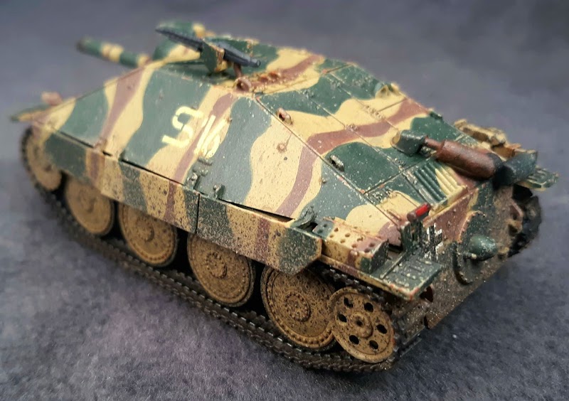 I'm still trying to adapt to my new lighting setup, so here's the first test photos featuring the completed Italeri/Warlord 1/56 scale Hetzer mit 2cm flak. Not having much material to go on, I opted for a hard-edged three color camouflage scheme. Unlike many of my previous builds, all the chipping is done with a brush. I wanted the flak gun to look like it had just rolled off the assembly line to be thrown inside the chassis with no painting at the factory, so I painted it a red oxide primer color. The netting is medical gauze, unrolled and lightly misted with green spray paint, before being wetted down with PVA glue and water. More pics below: link