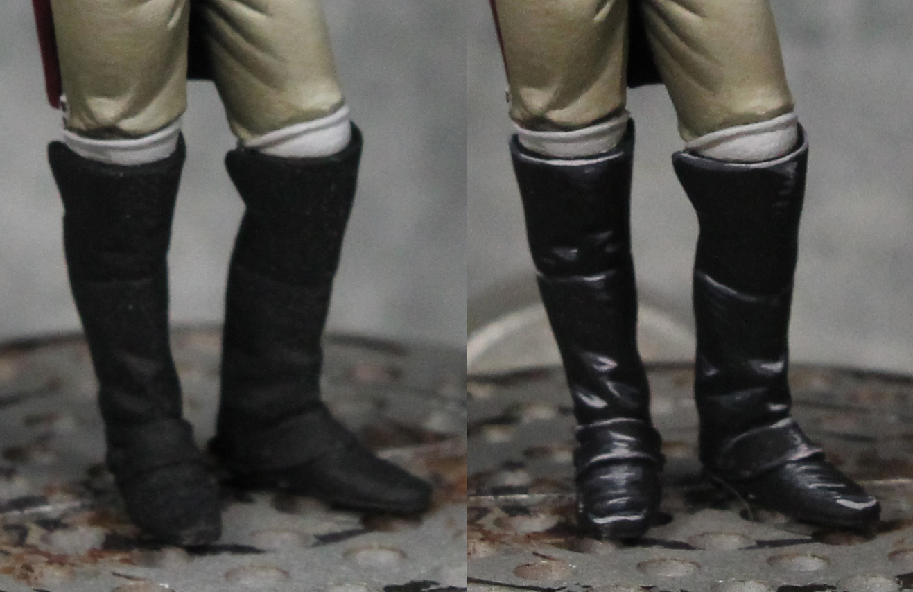 Thanks, Deadhead. Yeah, gloss varnish never quite looks right to me on the small scale. I've started to wonder what if I did painted the boots like I showed but then also applied a gloss varnish over it. Could produce interesting results… or terrible ones. Maybe one day I'll experiment and see which! :) Yes, the grey into the dark green is a useful tip. You can experiment with what shade of grey. A dark green + medium grey and dark green + light grey will produce slightly different looks. By the way, I've used the same trick with Dark Blue. Works great there too. |