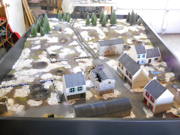 So if you're subbed to my Facebook page (if you're not, the link is in the sidebar…*hint, hint*), you'll have seen my progress on building a full gaming board based around the Battle of the Bulge on commission. The client wanted a full board, with protected sides; one side consisting of pine forest on a ridgeline and the other side consisting of a town at a lower elevation. To break up two dense terrain on either end, the middle portion would consist of open fields divided by low walls and fences. To provide extra cover in the open fields, I added some artillery craters. WAY more pics and info in the post below: link From this…