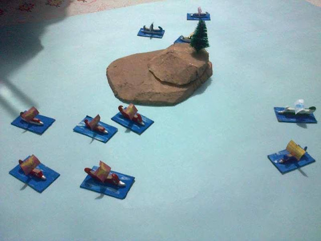 i was watching some ships and tought i can do a miniature better than that so i made this out of plasticine now i have them finished this was a battle using sons of poseidon by osprey great rules btw