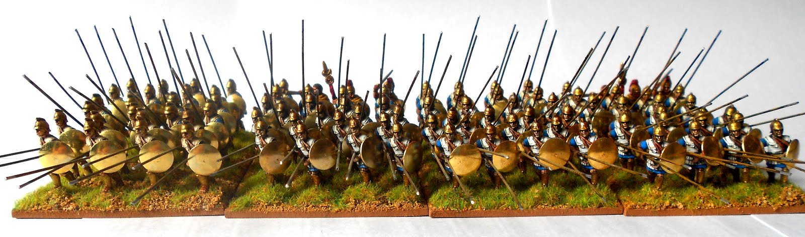 Hi everyone, I have recently finished my Seleucid regular phalanx (working on Silvershield regiment now) using 20mm Newline Designs "African pikemen". Again gave them all drawing pin shields. I gathered the 3 earlier 60mm square bases and set them up with the freshly done 60mm square base and 4 rear rank bases of 60x30mm bases with a few command figures. Photographed them a lot then set some of them up as a 12cm square pike block and took more photos. Here they are I hope you enjoy them.
