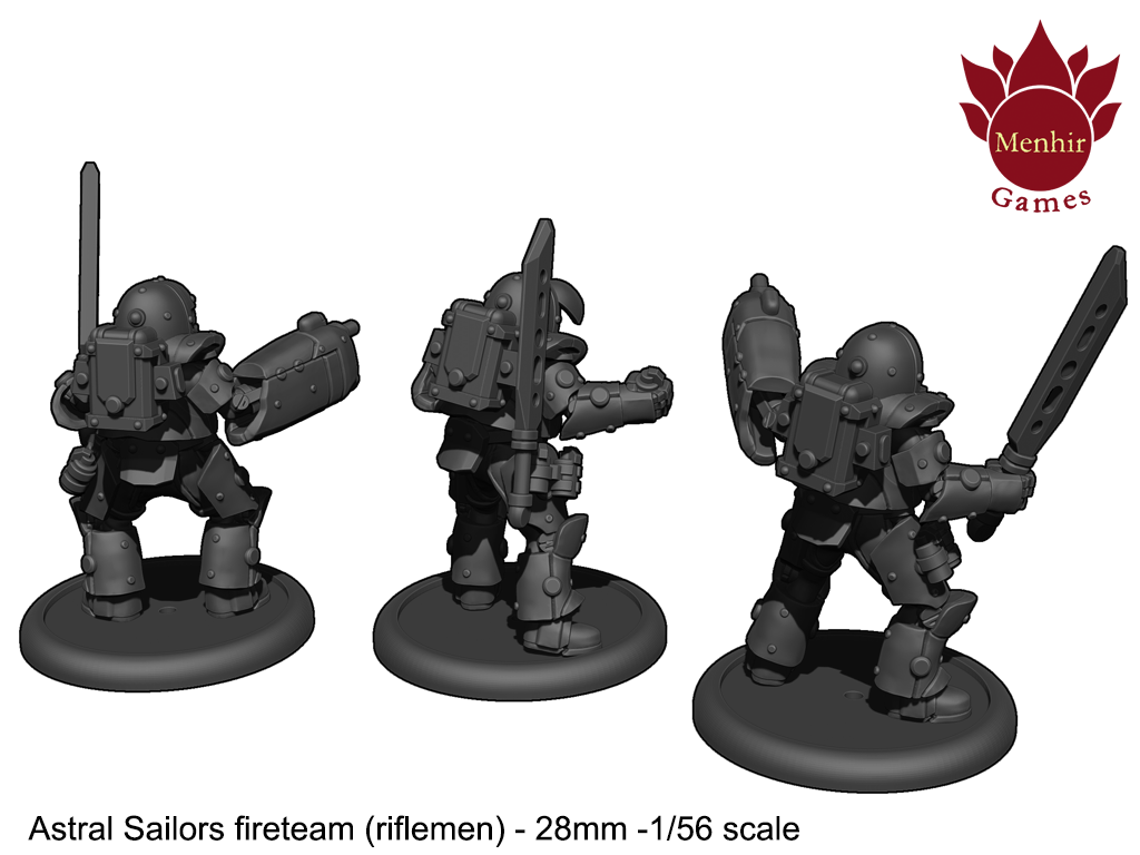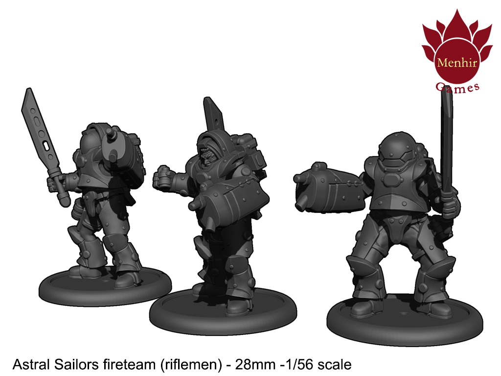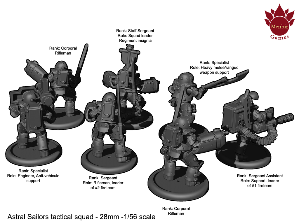 Astral Sailors basic functional unit is composed by 7 men: 1 Sargeant, 1 engineer (also operates anti-vehicle weaponry), 3 riflemen (1 with medical equipement), 1 corporal (Sarg. assistant, uses heavy fire weapons to support) and 1 Specialist (uses heavy mele/ranged weapons to fight big/strong enemy units):