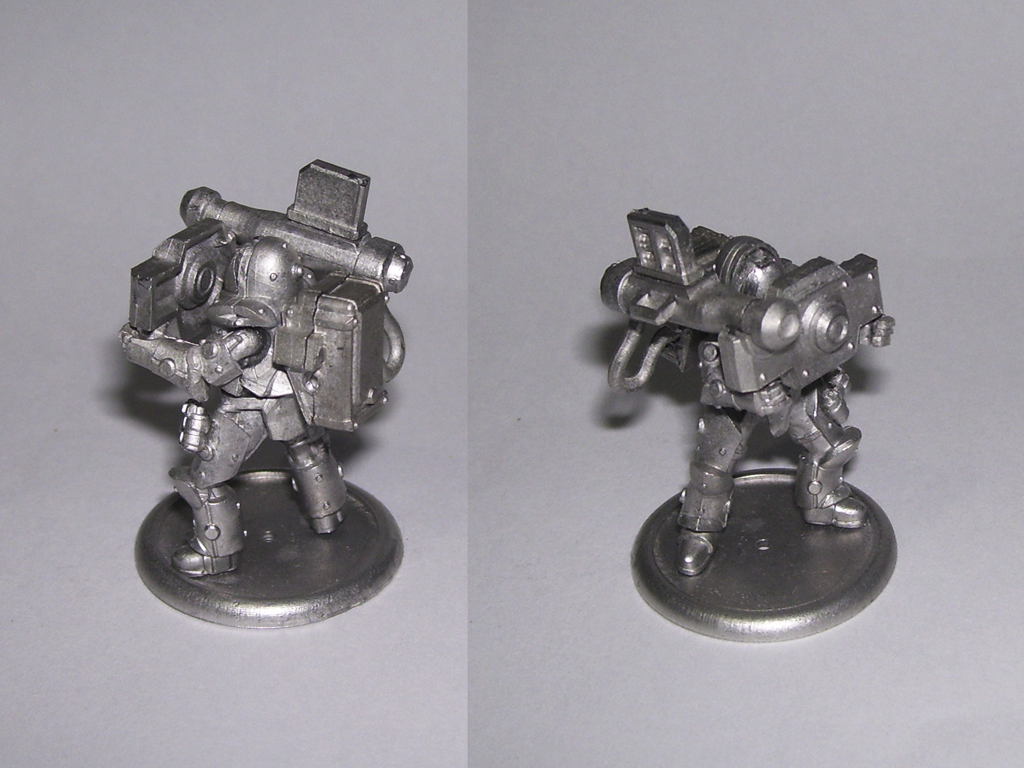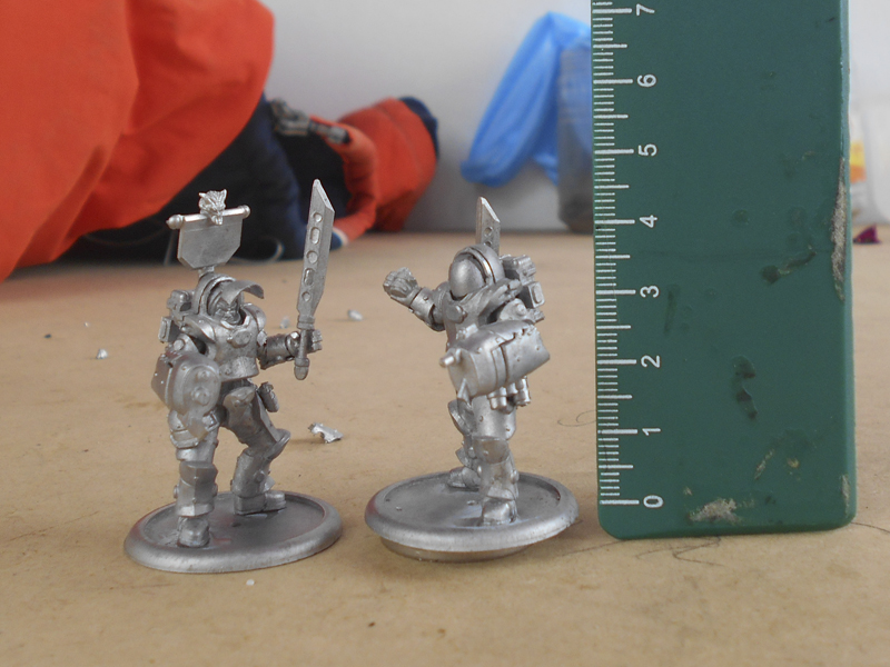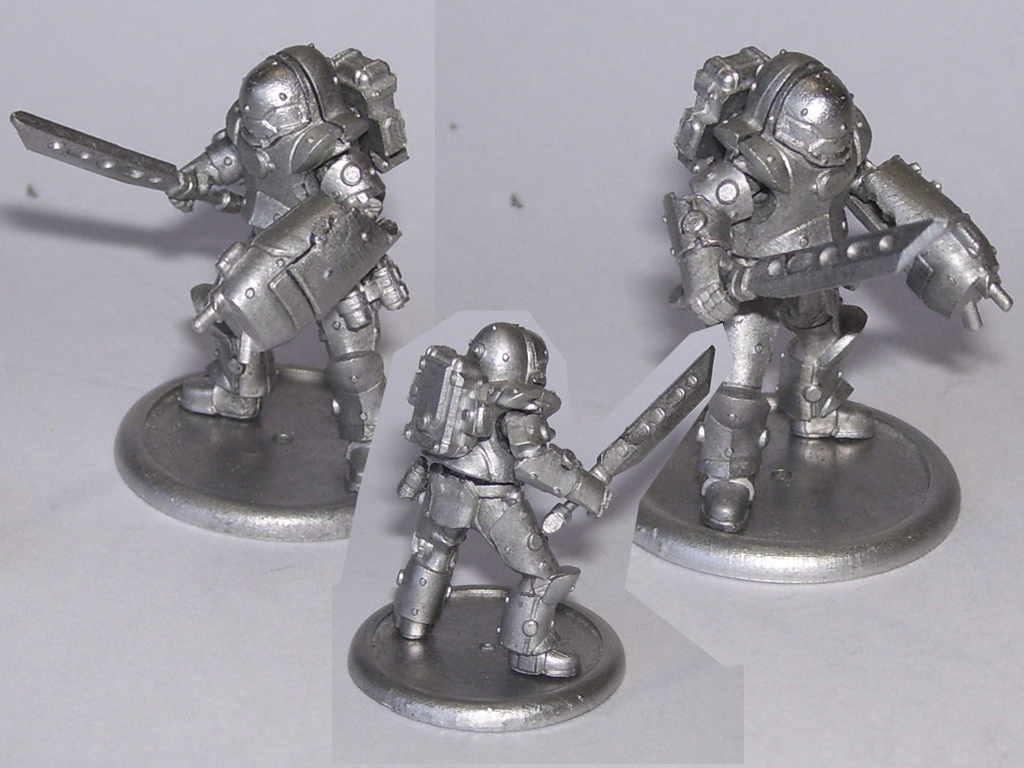 Hello folks, we would like to present you the firsts casts of what is going to be our first release in the near future. Painted sample will arrive soon! These miniatures represent superhuman elite soldiers, 6,6 foot tall (2 metres) and weighting about 300 pounds/140 kilos, with a modular armor and weapons system, multipose (rounded head joints), made of pewter. Here you can find images showing 3D renders with different combinations: link The prints: