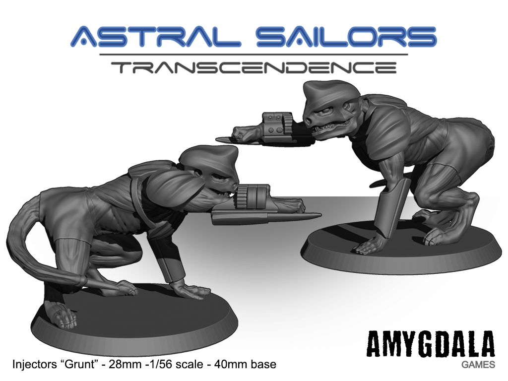 Injectors: serious hostile and competitive extra-terrestial life form discovered by the humanity (through an Astral Sailors exploration party) at the beginning of 25th century. The Grunt is the basic soldier armed with light melee and light range weapons, with basic protection that adds up to the already natural chunky body of these carnivories mammal-like intelligent beings.