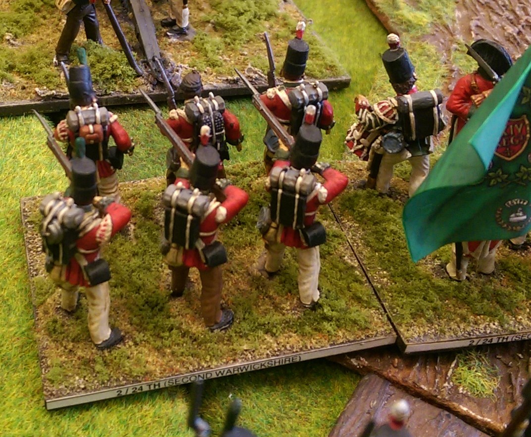 Personally I prefer not to see clear labeling on the rear of units. They show clearly in photos and distract from the miniatures. So to keep the battalion miniatures separate from each other, the basing uses a color coding system of small dots on the base rear edge. Generally for infantry as artillery and cavalry regiments are easy to keep separate. For Horse and Musket era armies. All miniatures are 25mm or 28mm based individually or in double paired bases. On infantry right rear corner of 3/32 or 1/8 wood height base I paint a battalion color: 1st – Green, 2nd – Med. Blue, 3rd – Yellow, 4th – Purple, and 5th battalion – Orange. If more than six battalion repeat the code coding. On left rear base corner, I paint special coding for the specific miniature. Not all miniatures in a battalion have this color coding. Red – Elite Co. (either light or grenadier), White – Armed with rifle in most cases, but represents any miniature not armed with musket, Pink – Specialist ability (think sapper or pioneers). In the center of the rear base edge, I paint in single or up to three numbers or letters code for the unit. Example – 22nd Legere would be 22L, 56th Foot – 56, 7th Foot Fusiliers – 7F. 42nd Highlanders – 42H, Pavlov Grenadiers – P or Pv if unique lettering code in Russian army, Hamlin Landwehr – HL, Soria I.R. – So……. examples And to complete the unit I.D…..on the base bottom underneath the based miniature a sticky paper label with complete unit name. When photographed…. this labeling system just blends into the mass of color presented on the tabletop. Easy to see if a unit is mixed with another…. the battalion right rear colors wouldn't match and the number or letter coding also wouldn't match. With dozens of tabletop battalions played by one player…. with ten players fielding 30-40 unit each per team side…. you quickly can see the tabletop, determine the unit name and battalion, and keep play in order. Example showing some Spanish infantry rear basing with the color and letter coding during the recent Battle of Arronches 1801 scenario.