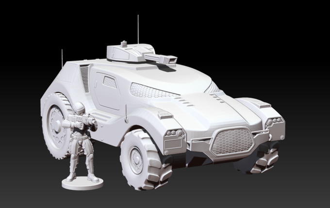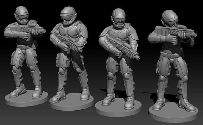 Captain pledge is £80.00 GBP and gets you 48 to 72 infantry plus two light or medium vehicles, terrain, dice, rules, etc. That gets you enough to get well into the game. Of course, we're not sure how many figures are in a platoon. In a far future setting, platoons could be a lot smaller than 40. Three squads of 8 (two fire teams) is plausible. In any case, I'm really sick of all of the "skirmish level" games out there. Vehicles just make no sense in them. Company and battalion games give a lot more scope to show the interactions of various support weapons with each other and with regular infantry, and vehicles begin to be plausible. |