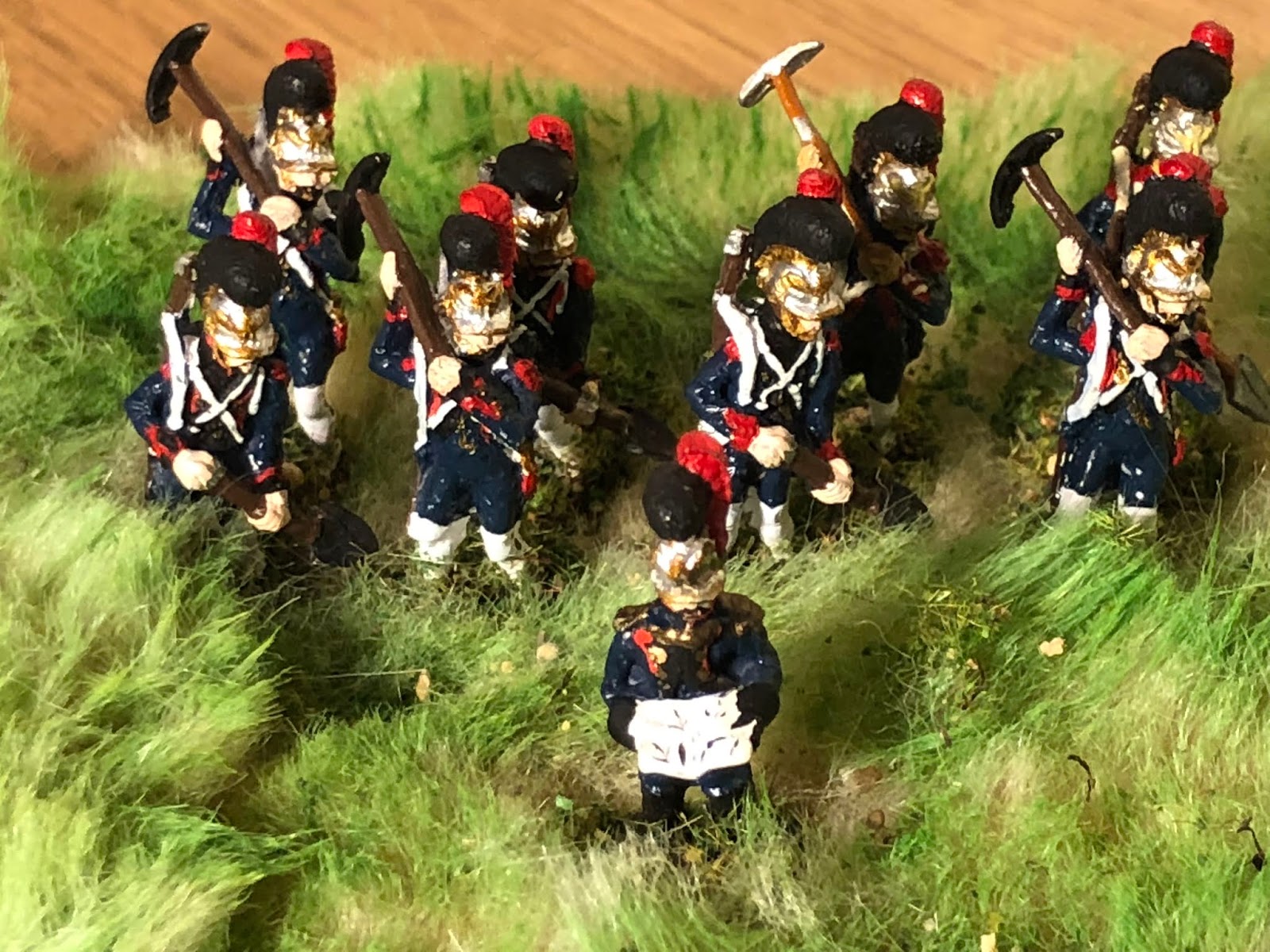 With the exception of a few Hinton Hunt, my Engineers are largely conversions from Zvezda Old Guard, Hat, the Waterloo 1815 dismounted Dragoons and some Franznap. This took quite a bit of work and there are about 250 sappers on parade.