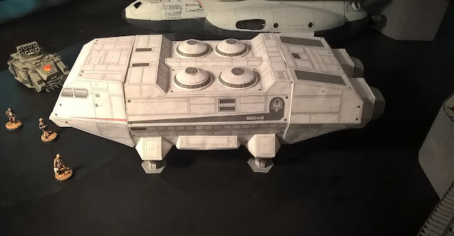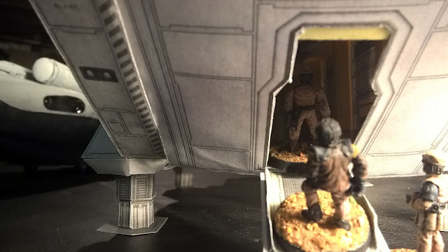 Thank you both! :) Yeah, the support is mostly for the large flat surfaces of the shuttle. The ramp is perhaps three layers of paper with some L cuts glued on. Those make for good support. The ramp itself isn't too bad, actually. It'll hold a metal 28mm miniature, which I count no small feat. But the chin from which it hangs is just a large double sheet of paper. With a hole cut in it, no less. At the front it's supported by the hinge where it attaches to the body, but at the back, where it's skinny behind the hole and where the ramp attaches, there's no special support. It's a minor flaw in the design. In order to allow the chin to raise so you can get a vehicle onto the elevator floor without obstruction you really couldn't do a lot there. Maybe some L or C channel on the exterior side of the chin behind the ramp would work. Of course, that would disrupt airflow, if you were worried about aerodynamics. (With a flying brick.) Still, it's such a small flaw I can live with it. (And a little discreet cardstock on the inside seems to have fixed the issue.) |