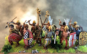 Hmmm Reference the bases, what we know of Gauls has them forming up in very close order.At Bibracre, for example, the Helvetii have their shields pinned together by pila. InnItaly they form uo on hills, again in clise order. The base shown looks lovely and displays the beautiful painting, but the order is far too loose! |