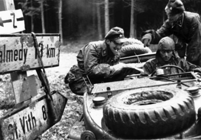 Hi Mr D. Spot on observations. These pictures were taken by teams of SS-Kriegberiter at a crossroads called Kaiserbaracke The two chaps by the half track were apparently SS-Oberscharfuhrer Persin and SS-Unterscharfuhrer Oschmet. There is a super section in the book, The Battle of the Bulge Then and now, whereby Piper with his famous chin dimple is compared to the chap in the Schwimmwagen who has alas not got one. Happy modelling, Chris |