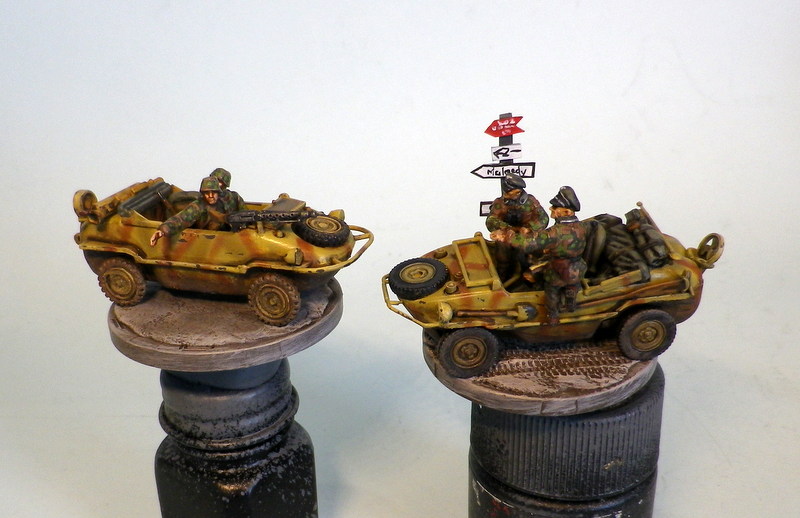 Hi guys 2 Chain of command recon markers almost finished for the missing lynx braille scale forum bottletop challenge, I need to add number plate decals and the windshield to the sign post schwimmwagen, and some flock on the base of the other schwimmwagen, pretty happy with how these have turned out, all comments welcome. heaps more pics here gunnerswargamming.blogspot.com/2019/07/172-schwimmwagen-vignette-finished.html
