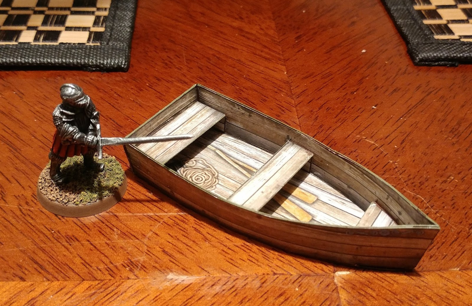 I have finished the final scenic piece I was missing for the Blood Moon mission from Rangers Of The Shadowdeep: a small boat. This one is a papercraft model made from the Smuggler's Rowboat kit by Dave Graffam Models. Very unusually for me, I made no modifications to the template before I built it.