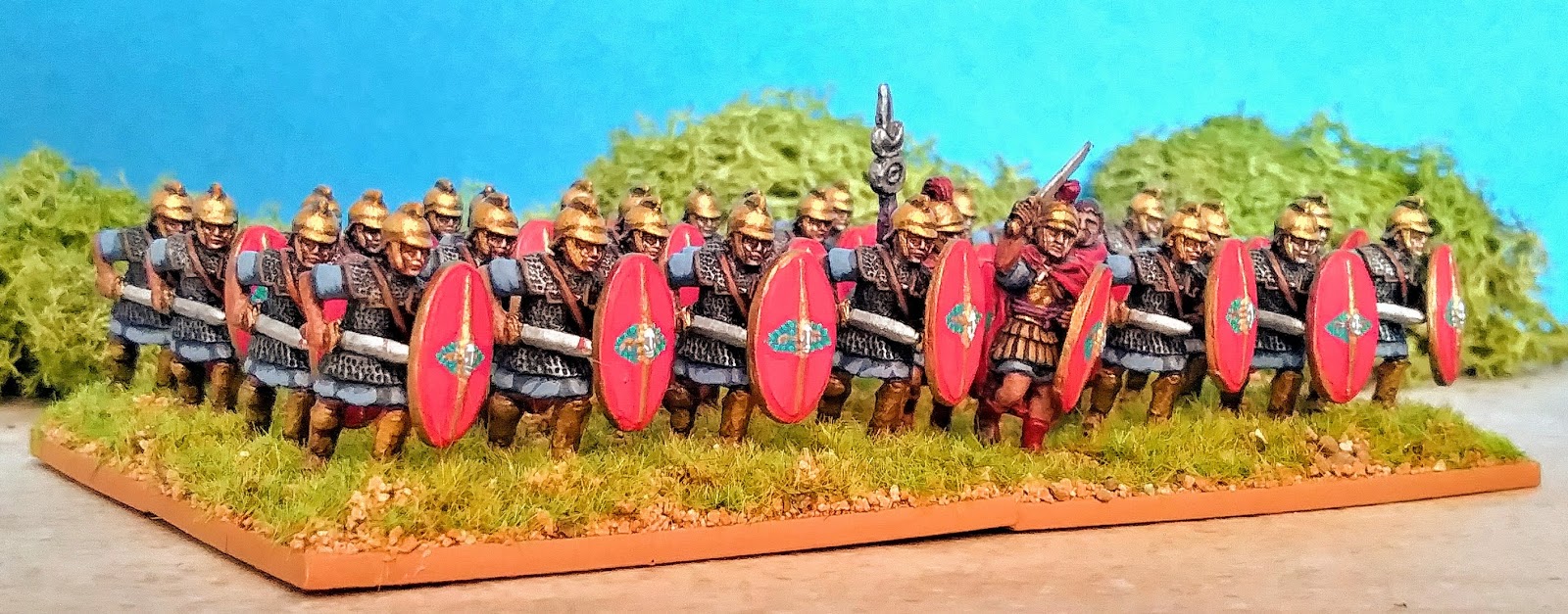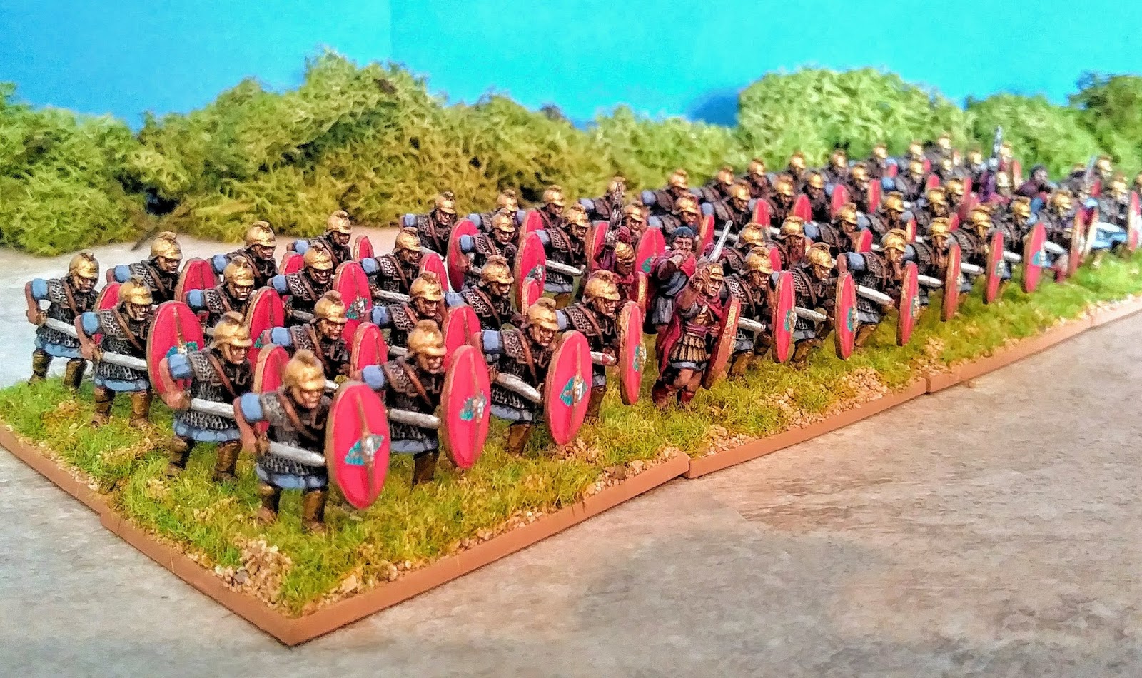 A favorite troop type that has always fascinated me after seeing Angus McBride's plates in Sekunda's Montvert on the Seleucid army! I represented them using Newline Designs 20mm African Veterans with Macedonian command figures all with Hellenistic thureos shields sourced from their Jewish javelinmen code. The shield pattern was the main challenge. Originally I had some home made transfers but the tester did not look good at all. I had no choice but to muddle through painting the design by hand which was a daunting prospect. In the end I quite enjoyed the challenge and process overall and will have to tackle more in the future. They are inconsistent but overall I am happy with the result and looks fine en mass at a distant. More details on the PARADE GROUND WORKSHOP. paradegroundworkshop.blogspot.com/2020/03/hand-painting-shield-designs.html showparade.blogspot.com/2020/03/romanised-argyraspides.html