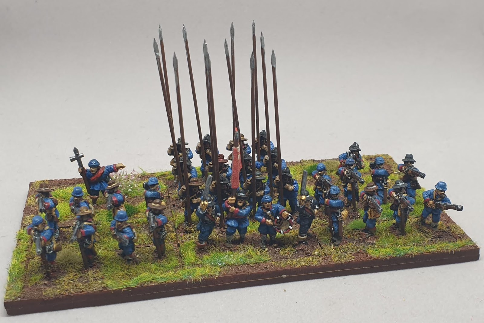 Thank Takeda, a mix of the two. GurKhan – the blue trumpet banner with white cinquefoil is from Richard Astley's troop of Henry Hasting, Lord Loughborough's Regiment of Horse. Richard has cornet and trumpet banners depicted upon his tomb bearing a cinquefoil. Young surmised that they were white (argent) cinquefoil on blue field – which seems pretty reasonable. Symonds notes that Loughborough's carried blew colours. Interestingly Astley's cornet has, through the game of Chinese whispers, become either Richard Astley's Regiment of Horse, and in one Jacob Astley's Regiment of Horse in wargames flag lists. Must say I am easily distracted today, must crack on with painting the Kent Trained Band… |