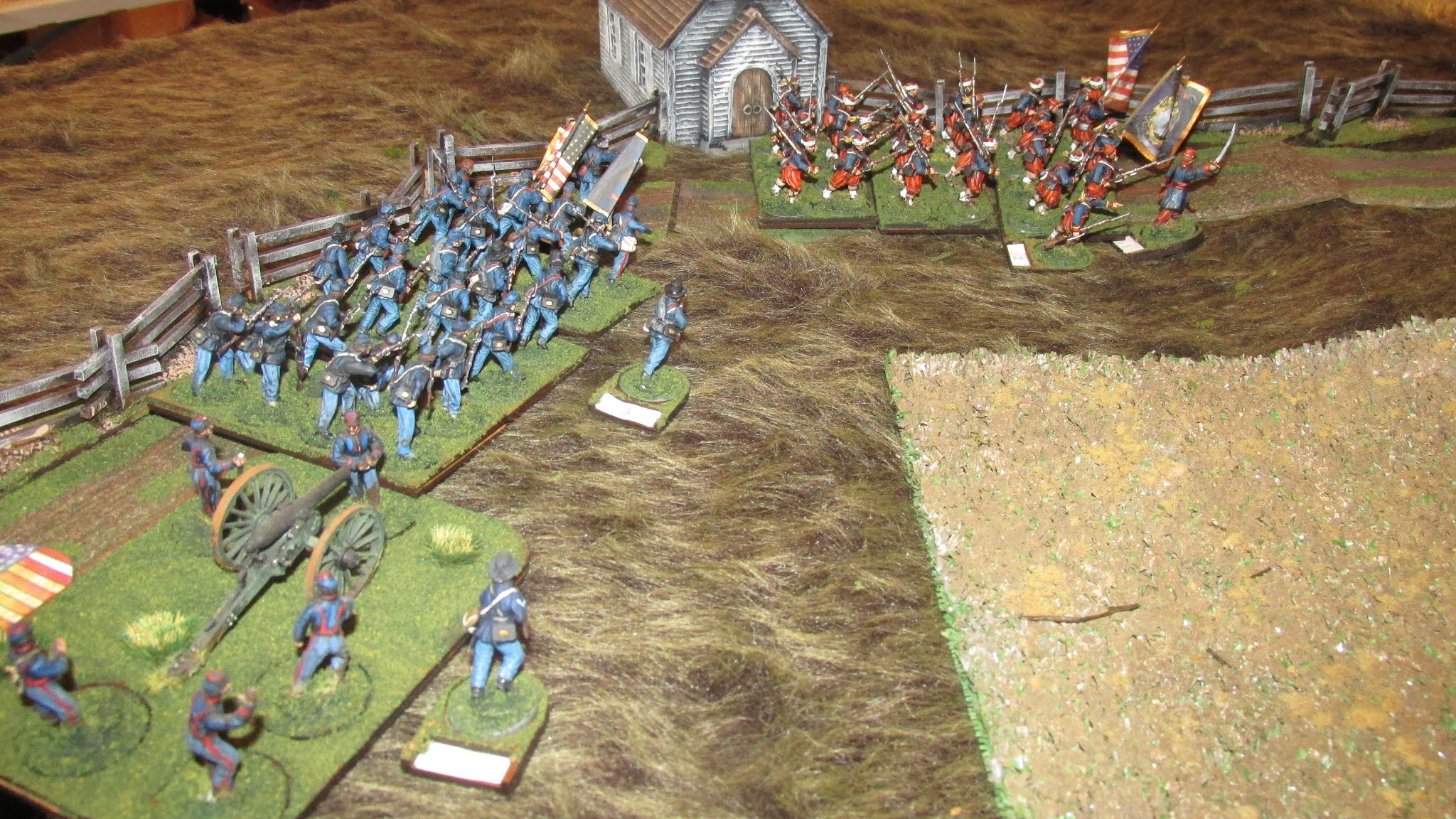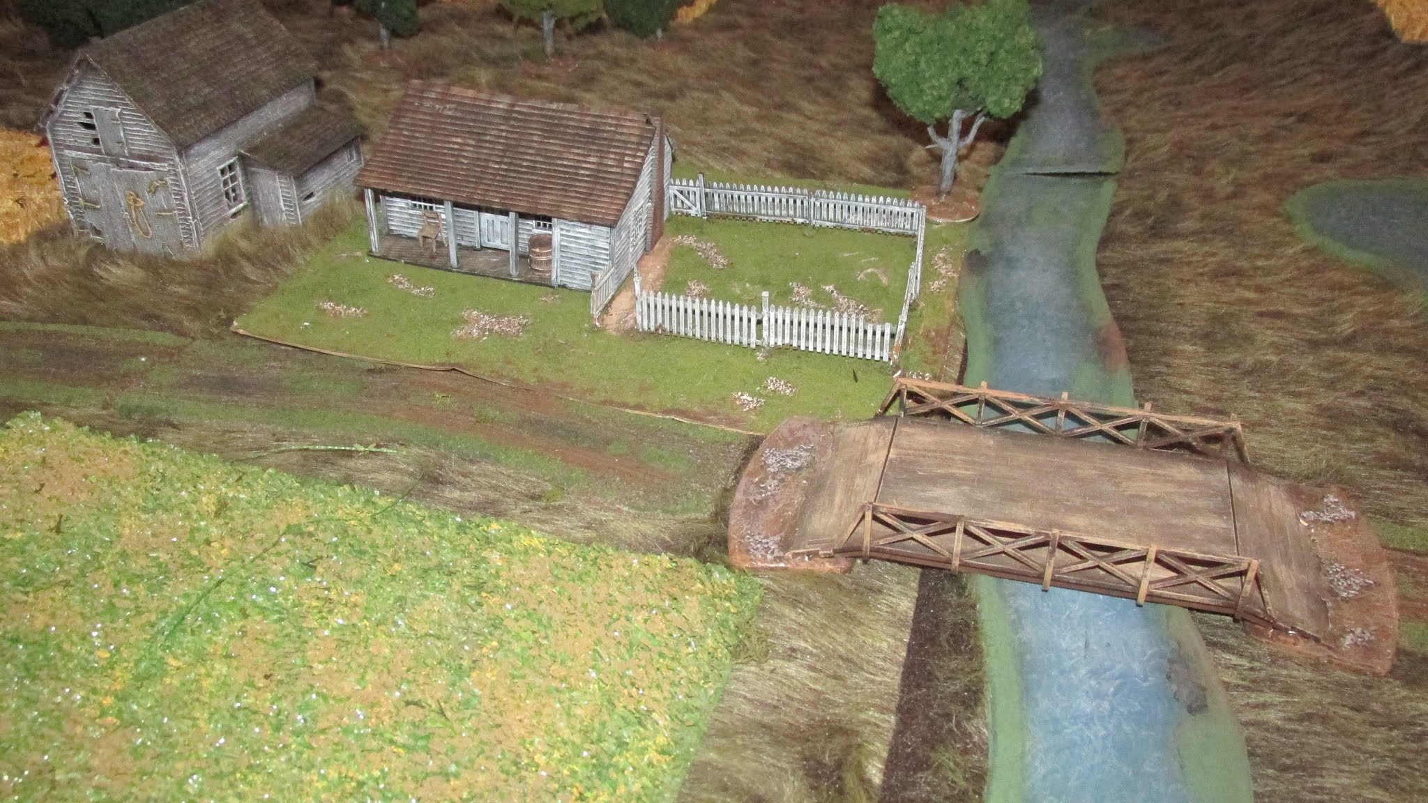 I got four turns done in my first Sharp Practice game using ACW figures. Miller's Crossing is the objective.