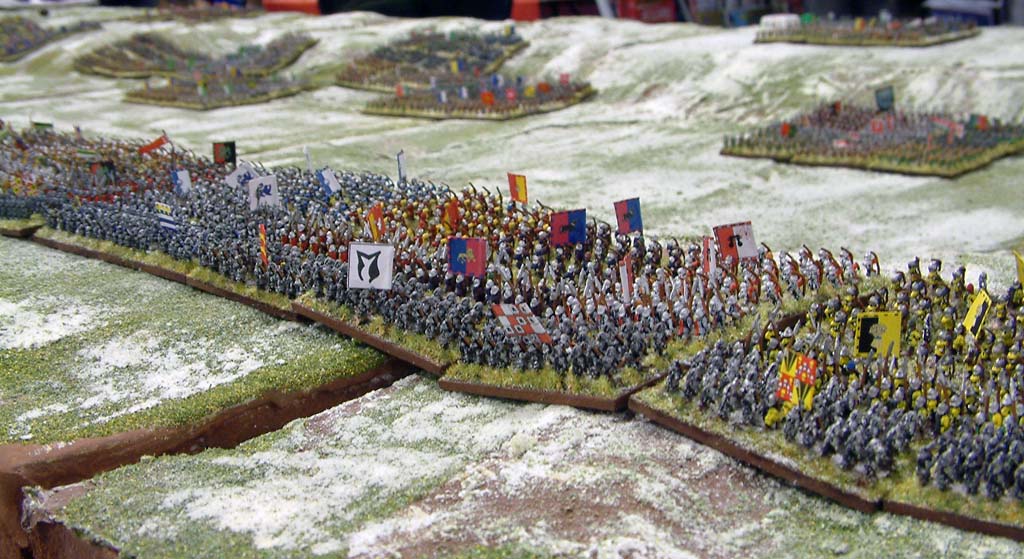 When I did my model game of Bosworth, the ground scale suggested that a 60mm frontage base would actually represent the real estate taken up by between 300 and 500 soldiers. To help people understand what this really meant, I made up a base using 350 2mm figures (in reasonably authentic depth etc. etc.) … the terrain on the battlefield itself was mixed to allow some harmony with the size of the model soldiers without destroying the illusion. In 6mm, 1:1 is quite challenging, even for medieval battles. Here's a shot from Raurigh Dale's Towton game …