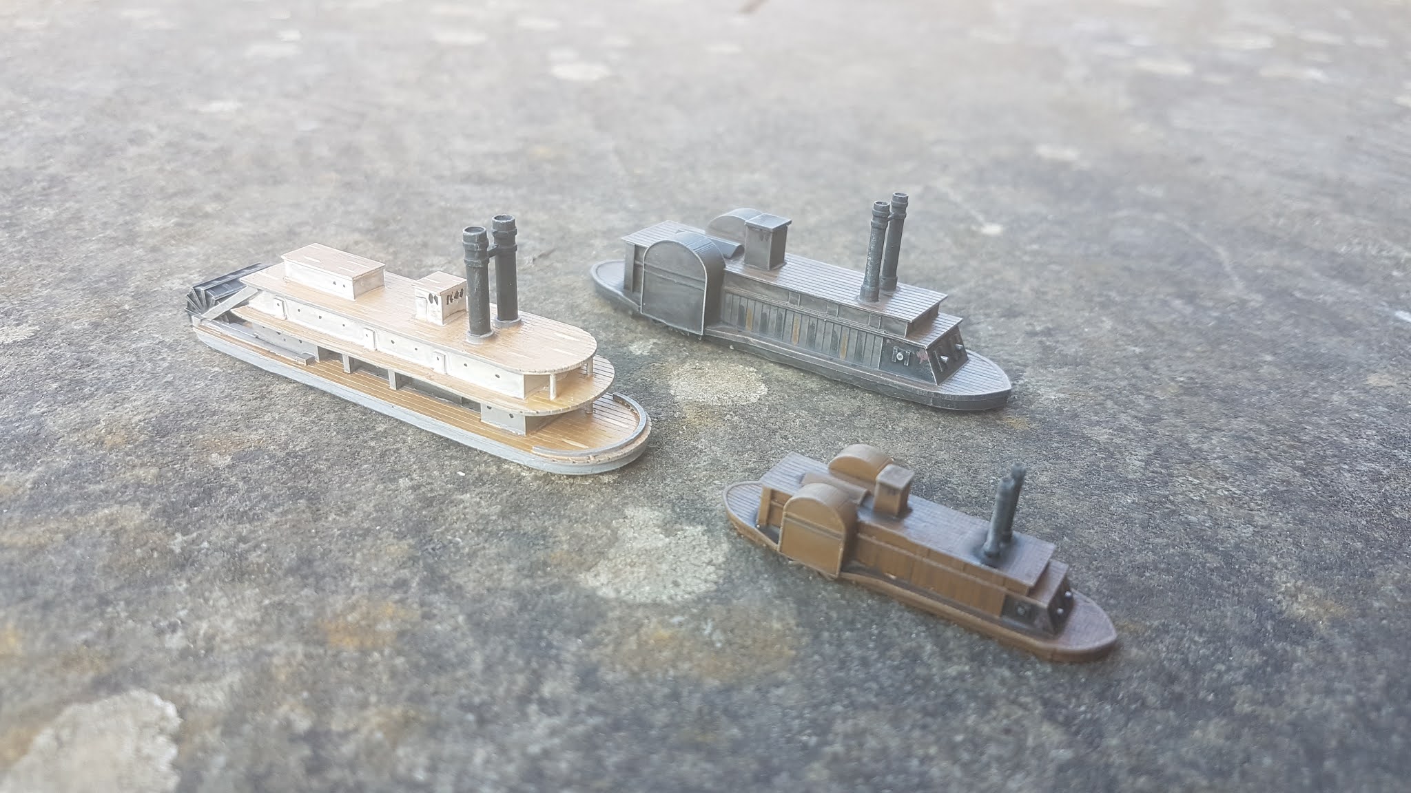 Having worked on some 3D models of stern wheel steamers for the ACW I decided to apply my growing skills to some side wheelers, and "upscaled" some of the models to 1/600. Latest adventures on my blog here: link