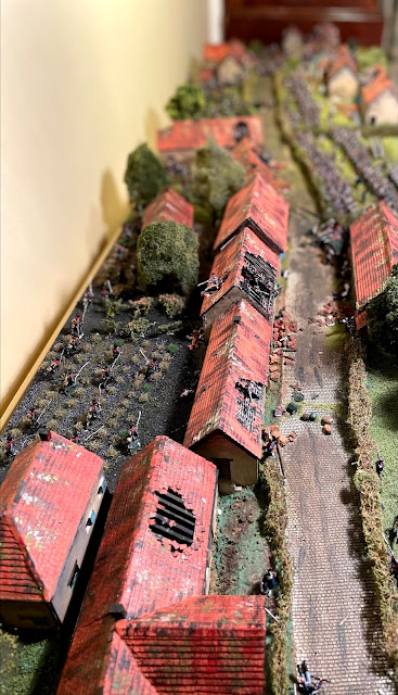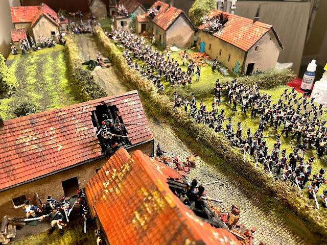 I've been working on the 1st Battalion, 1st Chasseurs of the Old Guard. The Battalion is generally thought to have stayed out of the fight at Le Caillou where it had the somewhat inglorious task of guarding the Imperial baggage. But evidence suggests that about half the battalion was fed into the fight in Plancenoit plugging the gap left by the collapse of the Young Guard. I am yet to fix that many of the Lutzow Freikorps on to the model, but even positioning 1/1st Chasseurs has its challenges – just where did massed Napoleonic infantry go in the close quarters environment of a village? Some Prussians have been added – not from the black coated musketeer battalions, but from the conventionally clad fusiliers in skirmish order. That said, one company is in greatcoats. The fusiliers are exploiting either side of the road, leaving the main thoroughfare to the musketeer battalions.