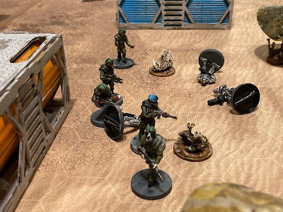 That all went pretty well. The combat rules are basic, D6 per shot with 3 DMs (range, cover, aim), so it moves along quickly. Results seemed more "realistic" than Stargrave (which has an opposed roll system which just doesn't seem/work right to me). The ability for some characters to activate before the enemy is a nice touch and some tactical thinking needed about dice assignment. The toughness stat and armour save seemed OK. Surprised that a stunned character could still fire with no penalty (except no aim), be tempted to house rule a -1 per stun. Having a +2 combat skill (like Erma) made a huge difference (3+ to hit not 5+).
