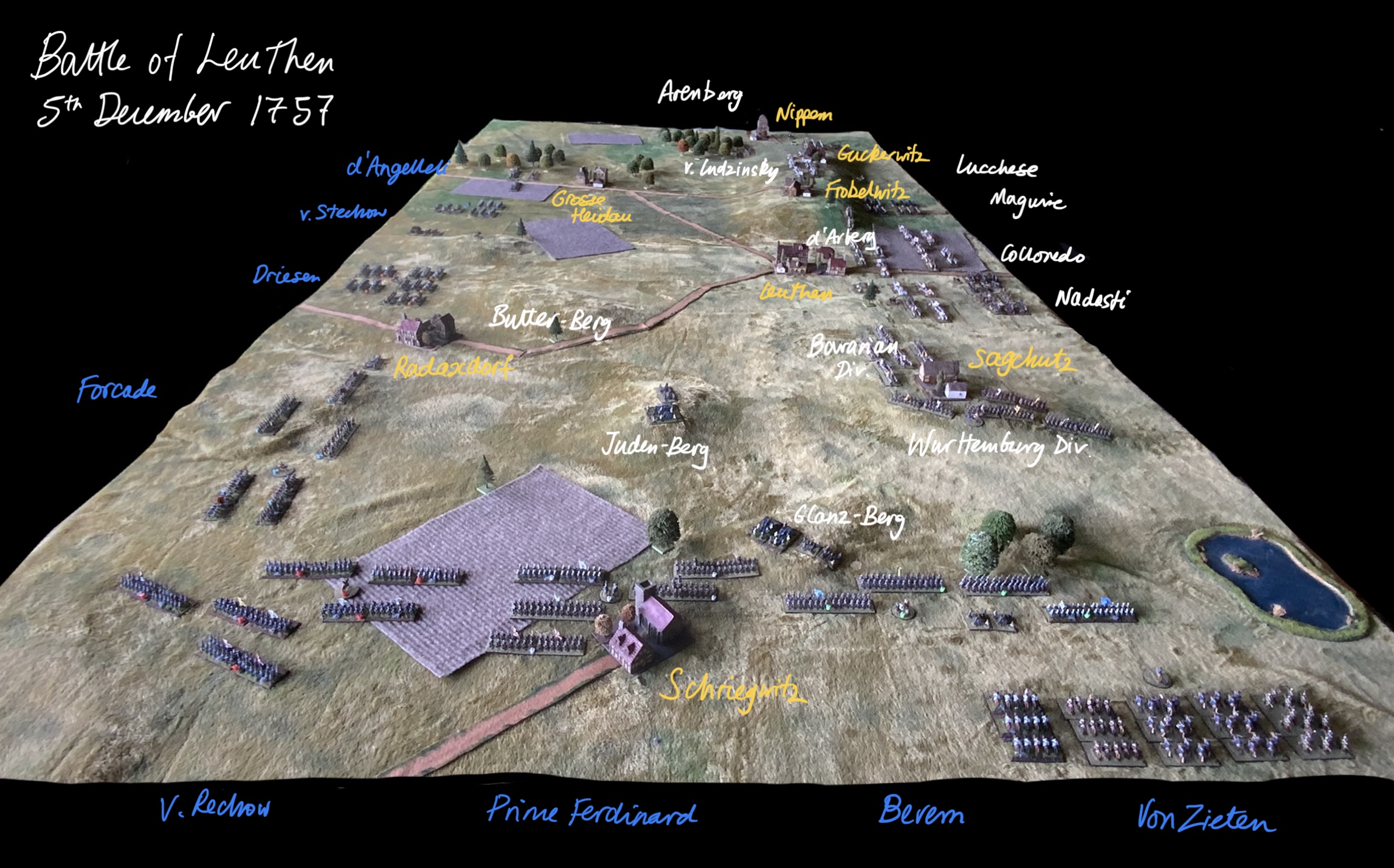 "About two and a half years ago myself and Martin were at a gaming show in the NE where there was a demonstration game of Blenheim in 10 mm this got us to thinking about a new project where the size and scale of figures allowed a more complete representation of the battle. After some thought I started collecting SYW Prussians and Austrians and Martin after a brief dalliance with Bavarians started collecting the same. With recent restrictions it has taken sometime but we have finally brought our plans together and this weekend we combined our collection to refight the battle of Leuthen…."