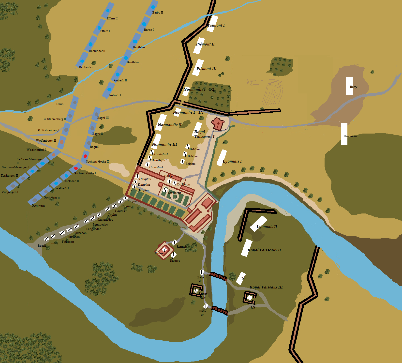Thanks all! I think you convinced me :-). As told, I am only interested in the Battle of Turin that I am trying to reproduce at 1:1 ratio, at least the part of the Battle that took place around the castle of Lucento (still existing even though in between factories). I agree with the usual tasks of Dragoons, but that day (6th September 1706) 30 French Dragoons squadrons dismounted and fought around and in the Castle of Lucento. I visited it (I live in Turin!) and I've gotten somehow an idea how it went that day. So I reproduced this map, based on the real status of the Castle today and on original maps dating back to 1750 (plus a second hand book concerning the castle); the result is: