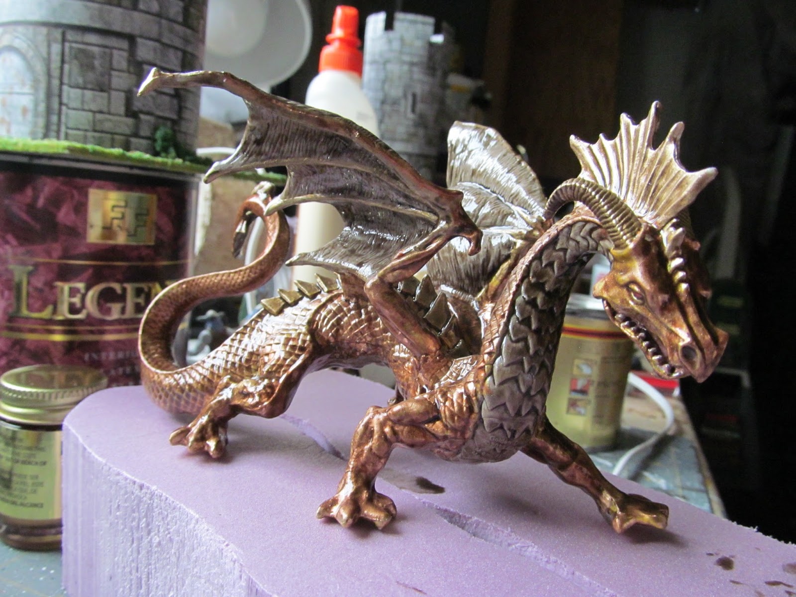 Here are some photo's of the Blue Magic Wash'ed figures, completely dried: frontal view, and side view. I have some figures which needs bases, first, then black priming/base coat painting. I am on the fence about using the White Magic Wash on them… I really like the Blue Magic Wash results, thus far. I think the blue wash will look better, overall, more 'natural', than the white wash will. I was very pleasantly surprised at how well the blue wash brought out the sculpting details in the figures. In some cases, it did not bring it out as much as I had hoped, but overall, I am satisfied with the results, thus far. I hope to spend some time, next week, applying gold, copper, and other colors, to finish one of each of the 10 poses in the set. This will give me a model to base my color schemes off of, for the remaining 110 mini's in the army. Like I said, I plan to do something different with the leader figures: either a golden weapon, or more likely, a bronze weapon. I used an expensive Gold acrylic paint to cover a toy Dragon figure, applying Royal Walnut Minwax Polyshades to it, to turn the gold, into Bronze, making a nifty Bronze Dragon. The original factory paint was gold -- I might have gotten away with just applying The Dip Technique to the factory paint [note that you can see the factory, yellow gold, and the antique (darker) gold acrylic I was applying, in this photo prior to The Dip Technique being brushed onto it – see next image], but I did not think of it, until now… I like the Bronze coloration of the Dragon, so my hope is that this will achieve the same result, on the smaller weapon areas on the Anubis figures. Experimentation is King, Baby! Cheers! |