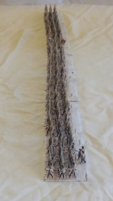 Okay, I will bite. 4 battalions of 500 soldiers in 3 ranks, deployed 2-up. 50 from each battalion are deployed as skirmishers. You then have 150 soldiers in each of the battalions, occupying 2' each. Even forgetting the supernumaries, that's 100 yards per battalion front, there is plenty of room to spare. A British battalion of that strength might get to 150 yards, but that is still within tolerance. It isn't so much that every battalion is assumed to be in column, as Barker's assumption that a brigade will usually have only half its combat power as a maximum in its front line. I assume he gets that from Paddy Griffith. In any case, at an army level, it doesn't then matter if two adjacent elements represent one brigade in front of another, or two brigades side-by-side each with half their units forward, their other half in the rear. |