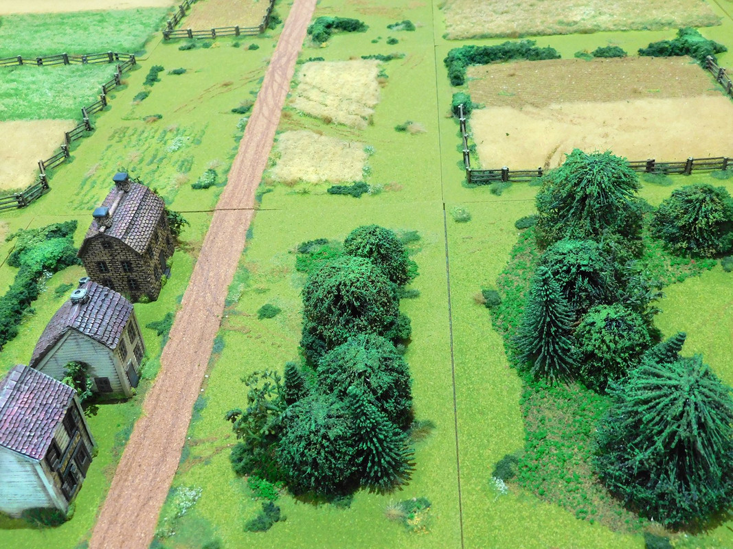 Here looking up the Wilmington Road (conveniently straightened to fit my pre-made tiles), towards the direction of Dilworth, and whence will come the British 2nd Grenadier Bn., 4th Brigade, and German Jagers in hot pursuit….