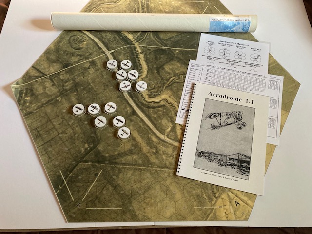 220.jpg"TMP link The board game includes the following: (1)23" x 27" vinyl hexed game mat (2) 12 clear acrylic aircraft stands with full color aircraft stickers (a) Fokker Dr. I; (b) Fokker DVII; (c)Pfalz D IIIa; (d) Pfalz D XII; (e)Albatross D Va; (f) Halberstadt CL II; (g) Sopwith Camel; (h) S.E. 5a; (i) SPAD XIII; (j) Nieuport 28; (k) Sopwith Tripe; (l) Bristol F2b (3) Aerodrome(R) 1.1 rules and QRS and master copy of aircraft stats spreadsheet (4) 3" x 24" round cardboard shipping tube (can be used for storage when game is not in use) * Additional aircraft tokens will soon be available, also WW2 and Korean War aircraft tokens. * This can be played as a regular boardgame OR 'remotely' against opponents anywhere in the world. * The Aerodrome(R) 2.1 and 3.1 aerial combat games can also be played using this hexed mat. * This game is complete, ready to play out of the tube. |