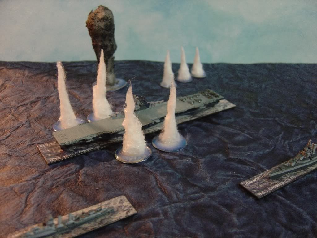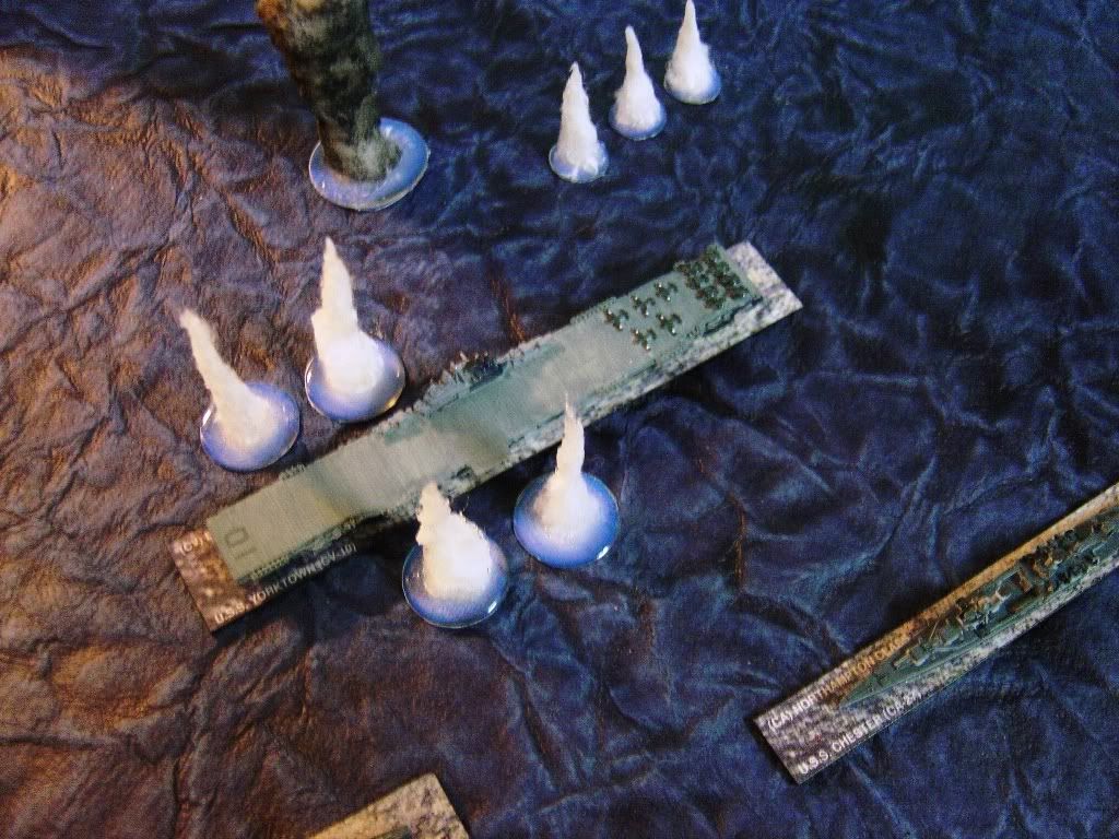 As an alternate to Mal's great splashes, the old standby of using golf tees is a quick solution. Groups of varied colors can be used to simulate dye-colored salvoes used sometimes to separate different ships for gun source identification. |