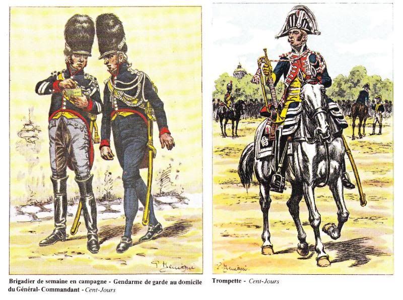 deadhead The artwork is terrific. I'll forgive the Gendarme d'Elite for riding anything other than a black horse, as he does look so good.Again that story of the helmet recovered form the field of Waterloo. That was mentioned here recently when Perrys produced their new figures. I cast doubts then and still cannot find any evidence for this. Are folk confusing this with the 1st Chasseurs who did wear a similar but less elegant helmet, a carryover from their Royal outfit? One of those was certainly retrieved Well! If this chap illustrated the same, I would go with Dawson/Rocco's rendition.